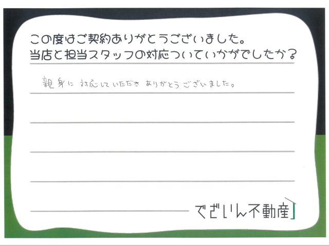 この度は、数多くある不動産業者の中から弊社にてマイホームのご成約を頂きありがとうございます。また、私どもの対応にご満足頂けたようで大変うれしく思います。