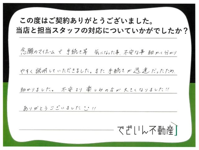 この度はご成約ありがとうございます。T様のお役に立てたこと大変うれしく思います。たくさんの不安があったかと思いますが、「不安より楽しみの方が大きくなりました!!」との事で何よりです。