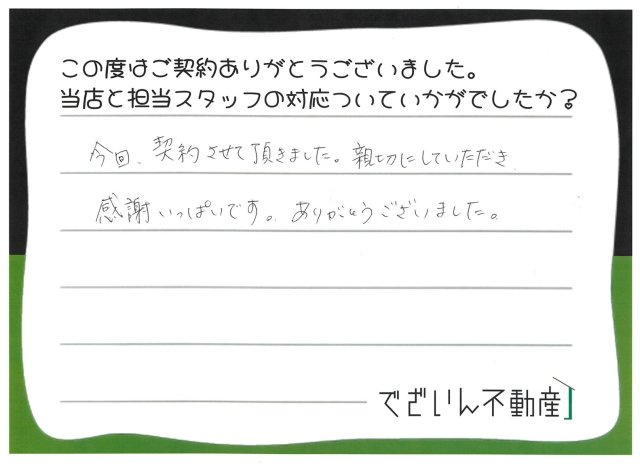 この度は、弊社にてマイホームのご成約をいただき誠にありがとうございます。K様に気に入って頂ける物件をご提案でき、良かったです。これからも安心して任せていただけるように精いっぱいサポートさせていただきますので、末永いお付き合いをよろしくお願いいたします。
